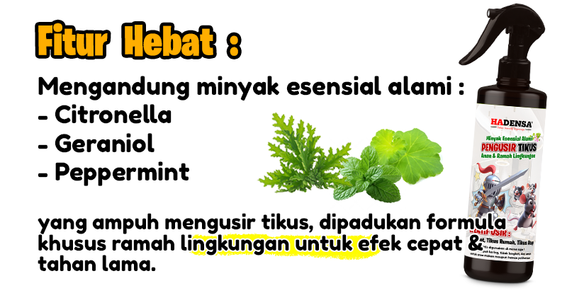 Mengandung minyak esensial alami (citronella, geraniol, peppermint) dan formula yang ampuh mengusir tikus, dipadukan alkohol & emulsifier ramah lingkungan untuk efek lebih cepat & tahan lama.